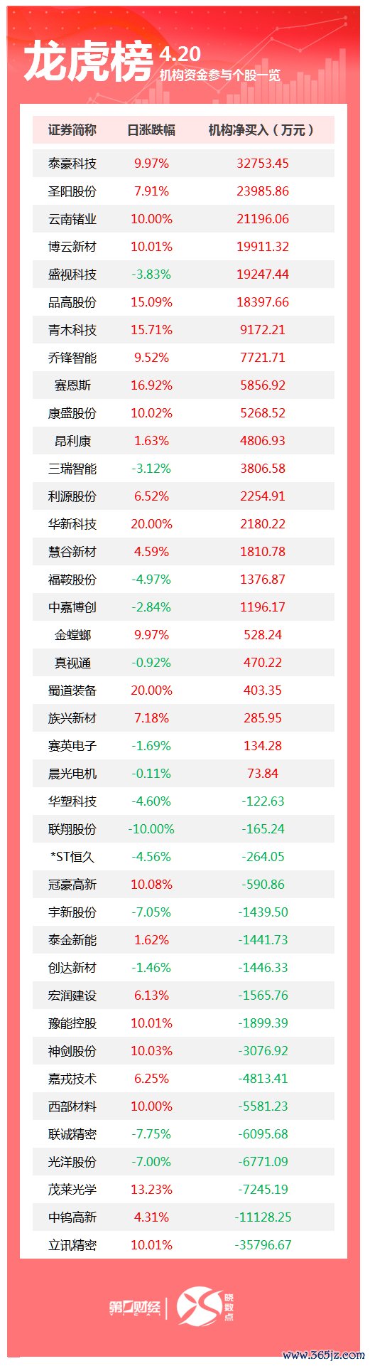 盘后数据显示,4月20日龙虎榜中,共40只个股出现了机构的身影,有23只股票呈现机构净买入,17只股票呈现机构净卖出。